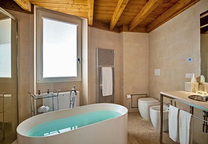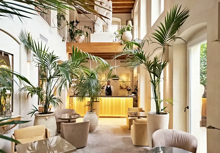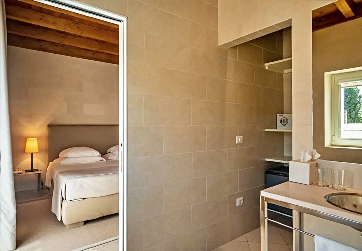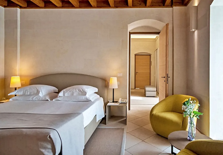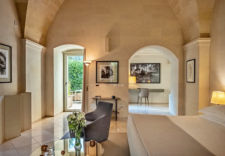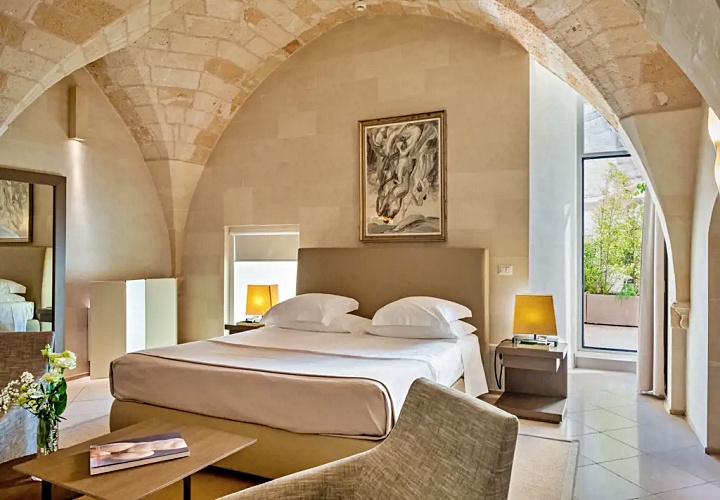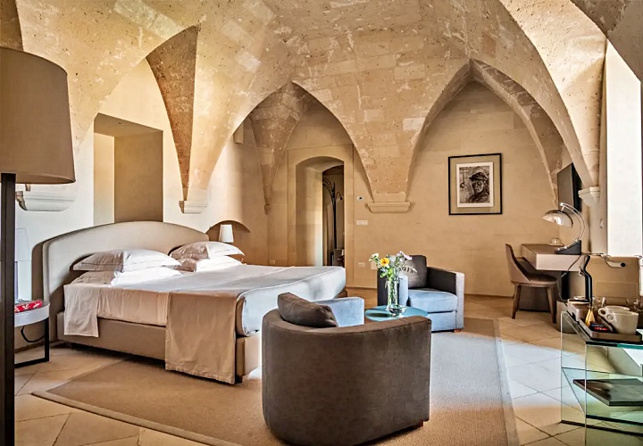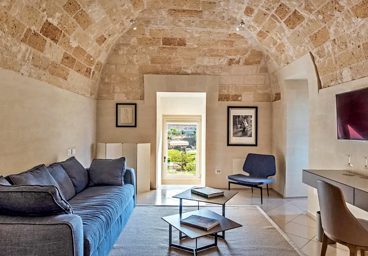 레체의 상징인 부드러운 황금빛 레체 스톤을 그대로 노출한 벽면과 아치형 천장이 특징입니다. 이 거친 질감의 석조 골조와 매끄러운 현대식 가구의 대비가 극적인 아름다움을 만듭니다.