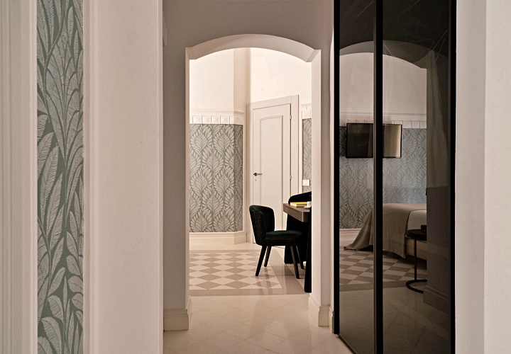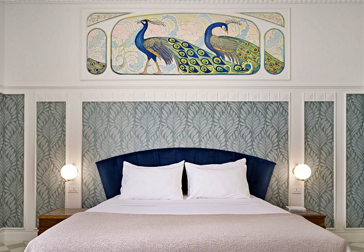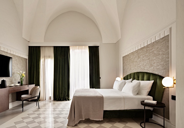 18세기의 화려한 프레스코 천장화와 투박하면서도 멋스러운 나무 서까가 객실의 골조를 이루고, 그 안에 정갈하고 현대적인 가구를 배치하여 시간을 초월한 우아함을 연출하고 있습니다.
